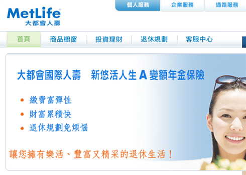 大都会人壽 owner 10年前 大都会人壽 Metropolitan Life Insurance 所在/台北市松山區南京東路五段1號8樓 関連するとおもわれる記事 台銀人壽 南山人壽 国華人壽 幸福人壽 合作金庫人壽